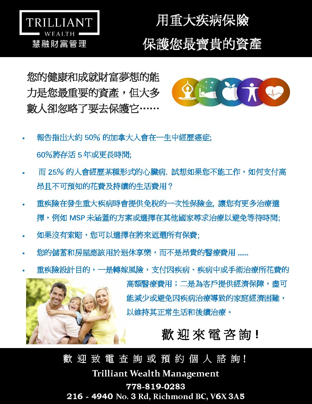 Your health and ability to produce human capital is your most important asset, but most neglect to protect that asset…… About 1 in 2 Canadians will develop cancer; 60% will survive for 5 years or longer, how to pay for…